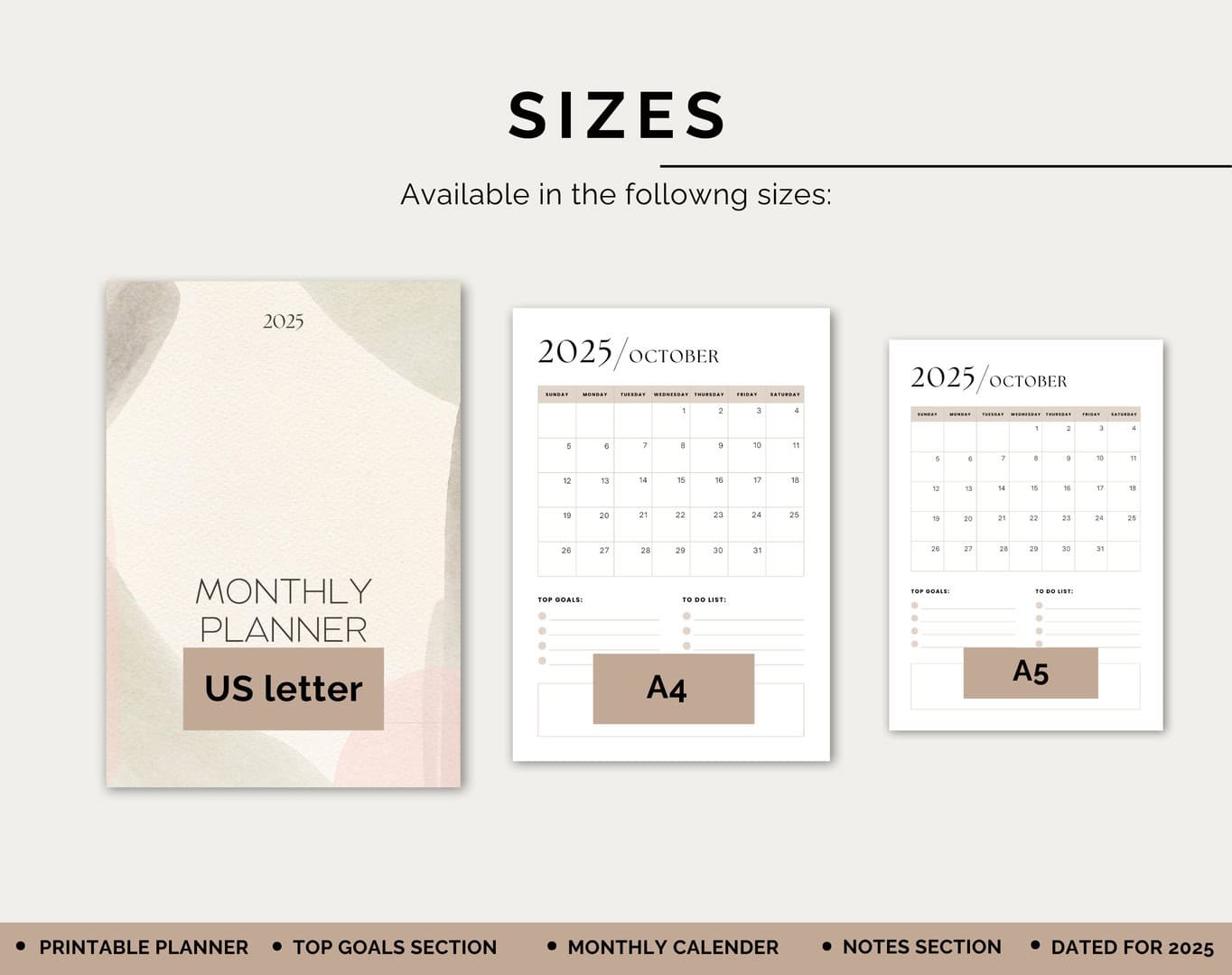 Start 2025 with focus and structure! This Printable Monthly Planner is designed to help you stay organized all year long. Each page features a full monthly calendar, space for setting top goals, a to-do list, and a dedicated notes section for additional planning. Available in three popular sizes (Letter, A4, and A5), the planner is crafted in elegant beige tones for a minimalist and stylish look that’s easy to print.