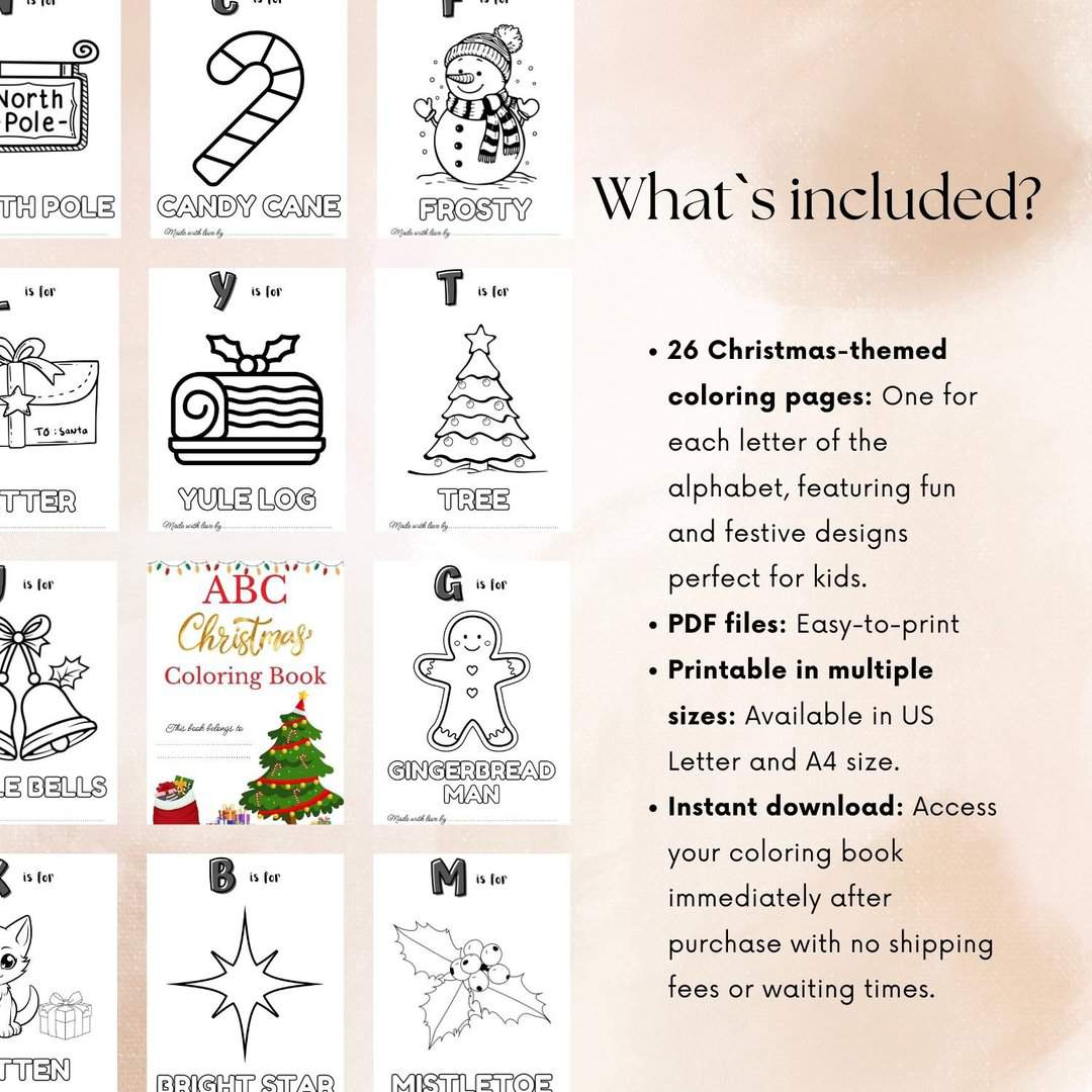 Get into the holiday spirit with this festive ABC Coloring Book Christmas Edition! This printable PDF includes 26 Christmas-themed coloring sheets, each featuring a different letter of the alphabet. Perfect for young children who are learning their ABCs, this coloring book provides a fun and educational activity during the holiday season.