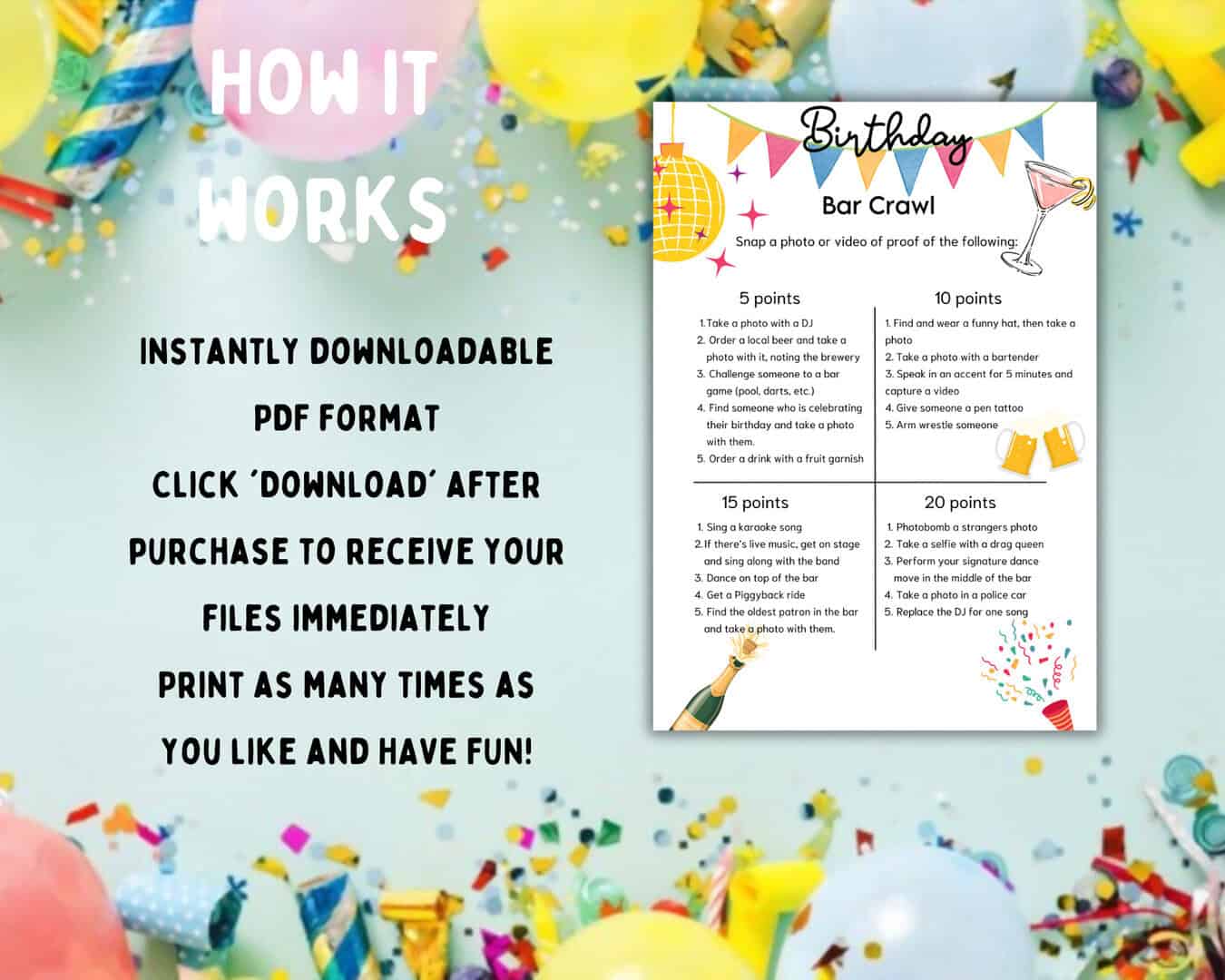 Make your bar crawl games the highlight of the night! Grab your digital download today and let the good times roll! 🍹🎉