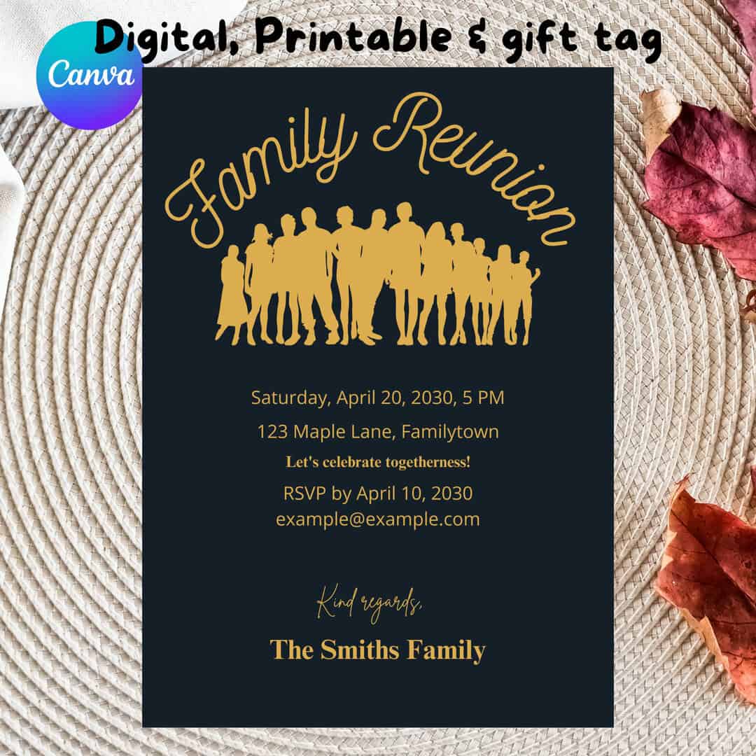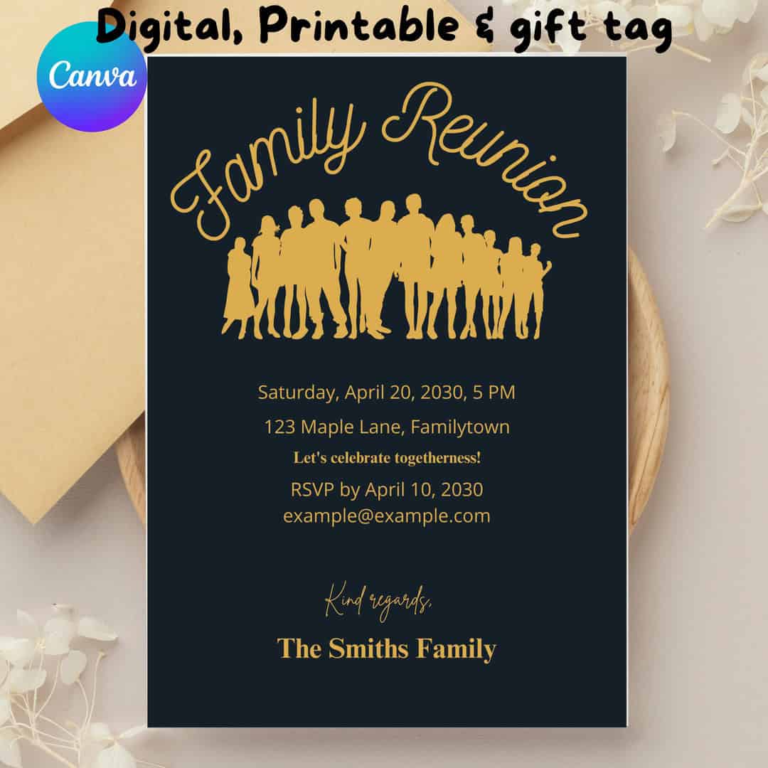 Black and Gold Family Reunion Invitation, Editable Family Reunion Template, Family Reunion Invite, Family Reunion Party, Canva Template, Gift Tag Template, Family Day Celebration, Digital Invitation, Sophisticated Reunion Invitation, Printable Invitation, Instant Download, Family reunion invitation, black and gold invitation, family reunion party, editable invitation template, pintable invitation,digital invite, reunion invite, reuion party, canva template,family day, friends, christmas invitation,instand download