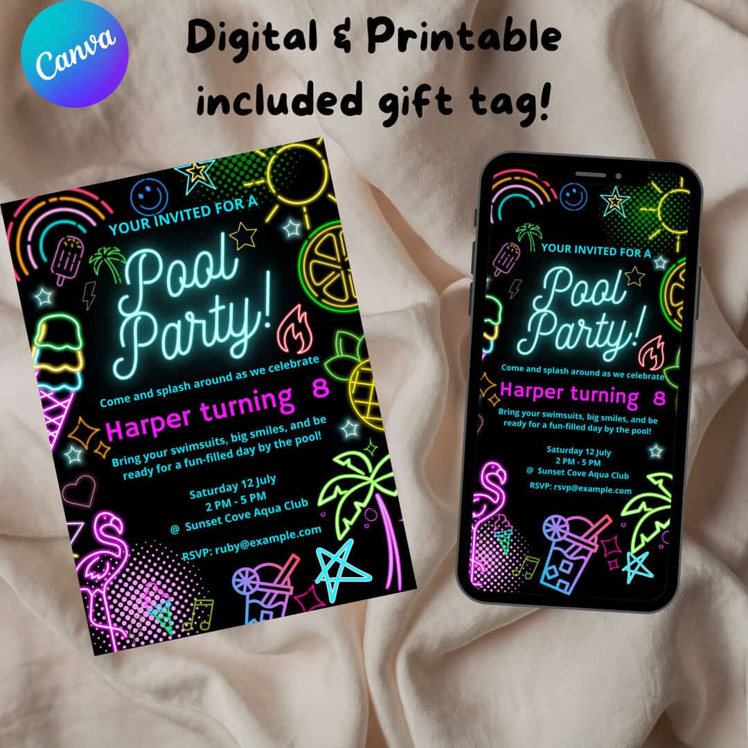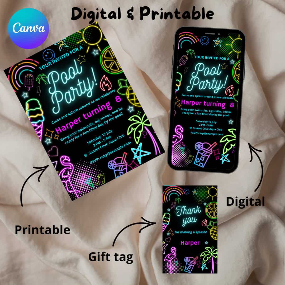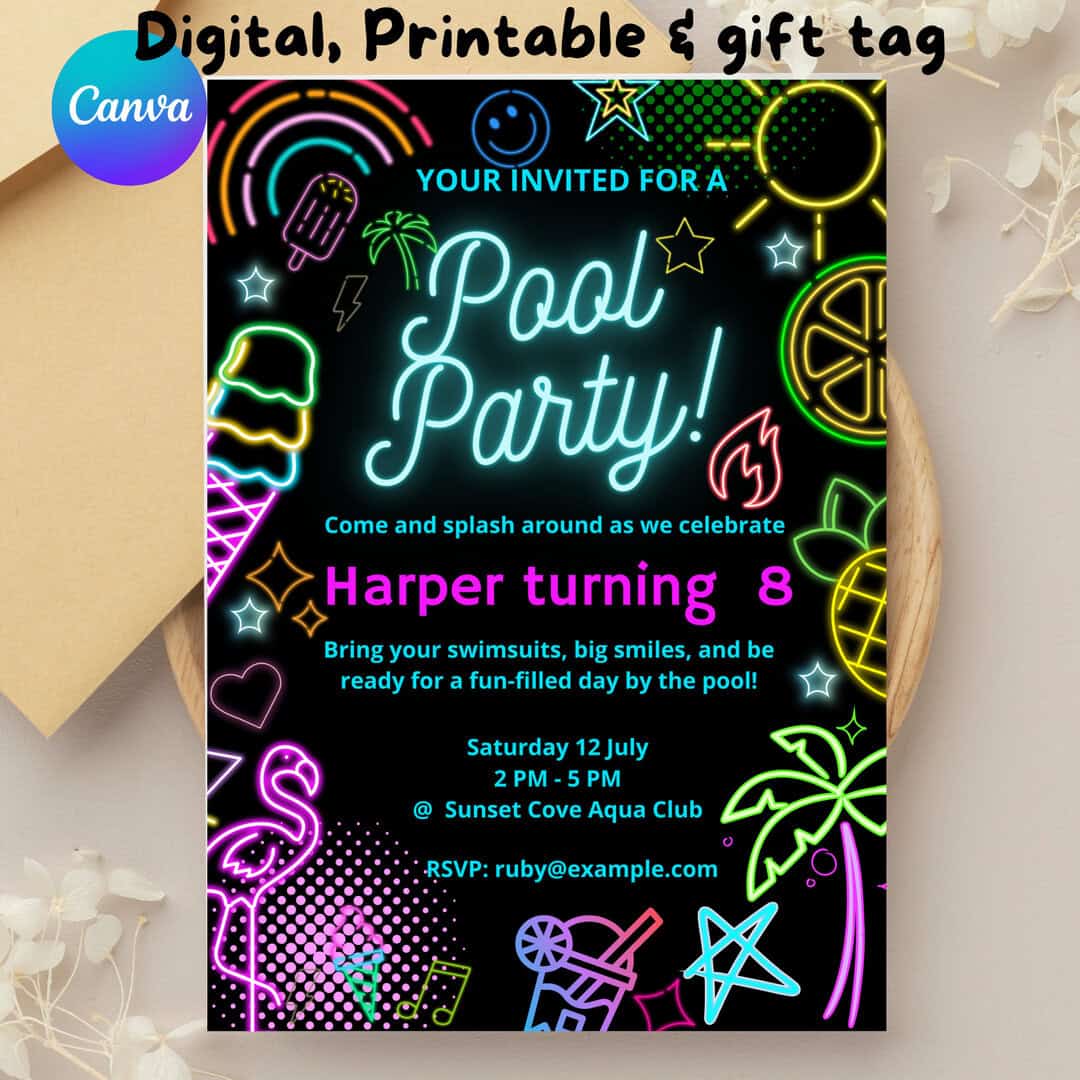 After a whole year of fun, laughter, and growing up, it’s finally time to dive into another amazing birthday! 🏊♀️🎉 This adorable Neon Pool Party Invitation is the perfect way to invite friends and family to a splashtastic celebration! 💖✨