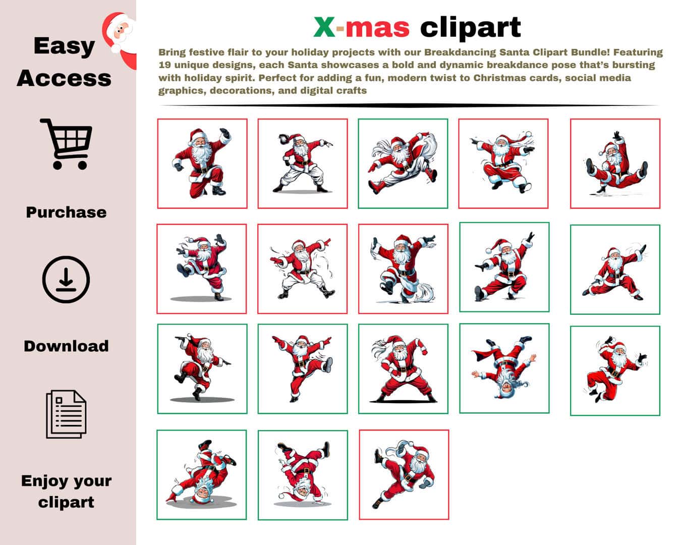 Add a hip-hop twist to your holiday projects with our “Breakdancing Santa” clipart bundle! This collection features 19 jolly Santa Claus designs, each showcasing Santa in an energetic, breakdance pose. Perfect for Christmas cards, festive decorations, social media graphics, or any project needing a playful and modern holiday vibe.