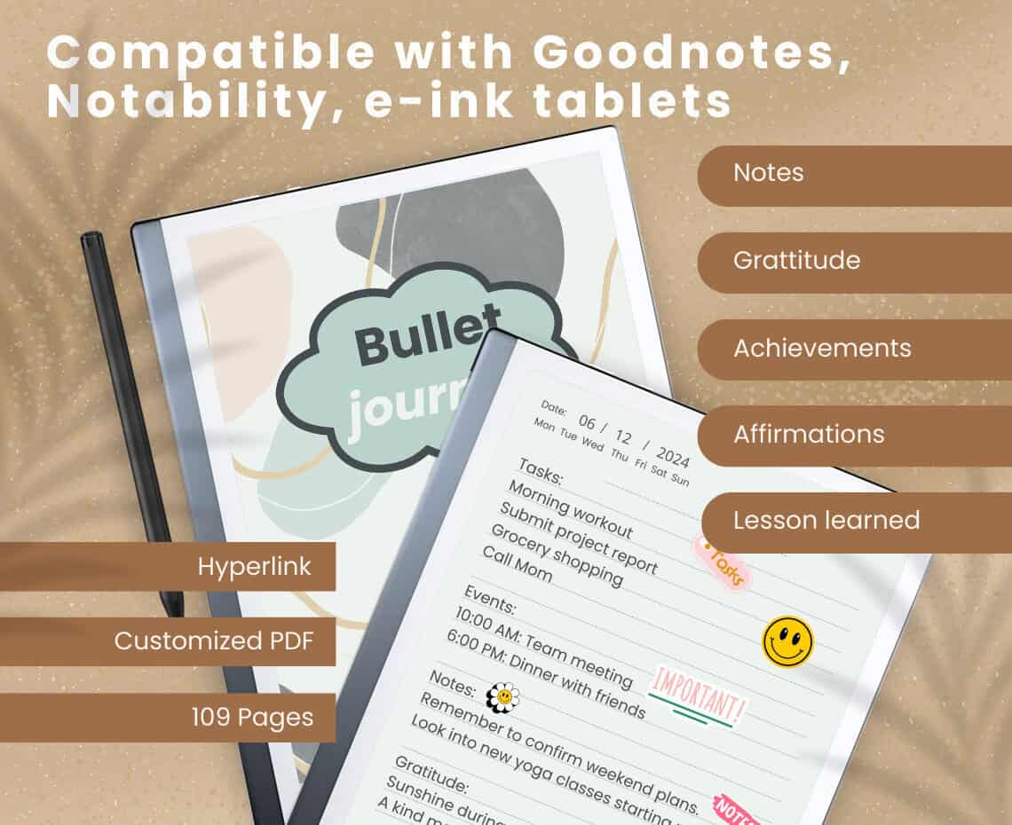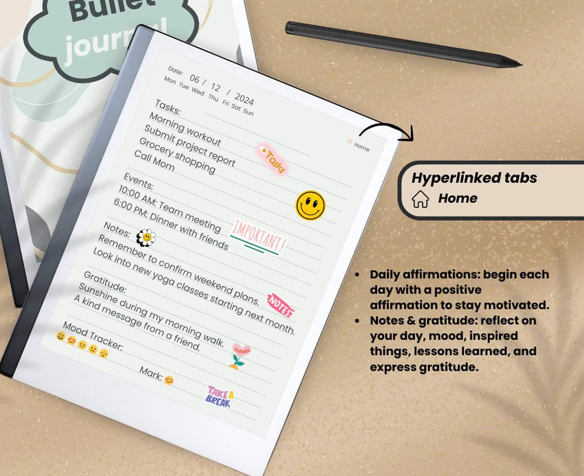 Bullet journal pages, bullet journal template, undated journal, undated bujo, bujo spread, daily journal, digital bullet journal, e-ink planner, journal templates, Self care planner, Digital journal, interactive PDF, Goodnotes planner, digital notes, ipad digital notes, Notability template, self care journal, undated planner