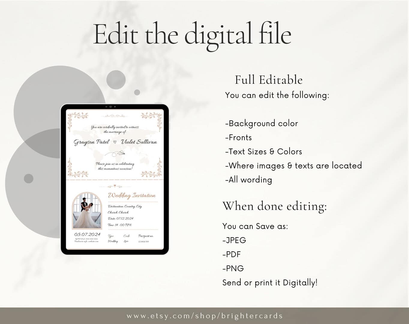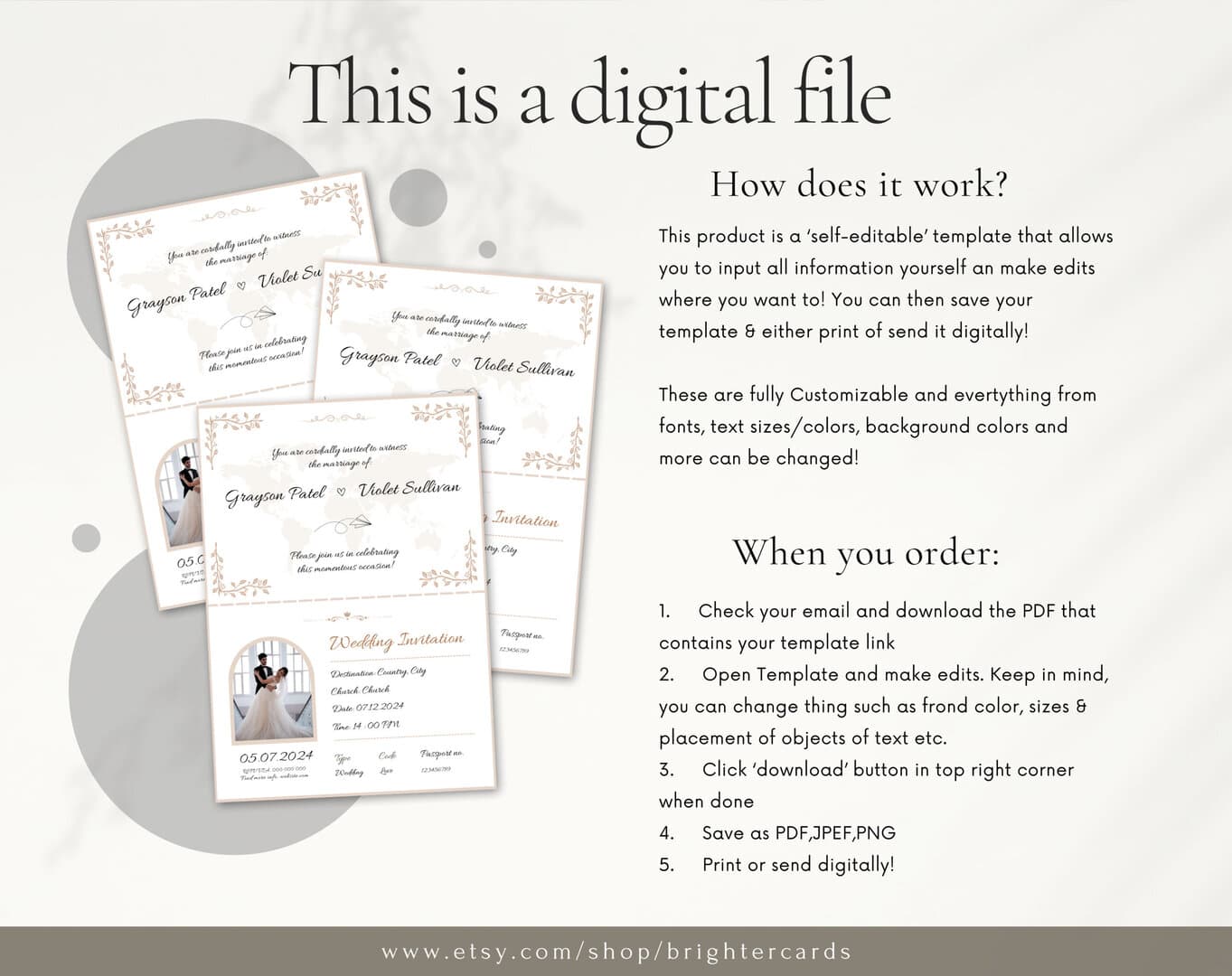 Take your guests on a journey to love with this Digital Boarding Pass Wedding Invitation! Perfect for destination weddings, this unique and editable invitation adds a fun, travel-inspired touch to your special day. Designed to resemble a real airline ticket, this template is fully customizable, allowing you to personalize names, dates, locations, and flight details with ease.