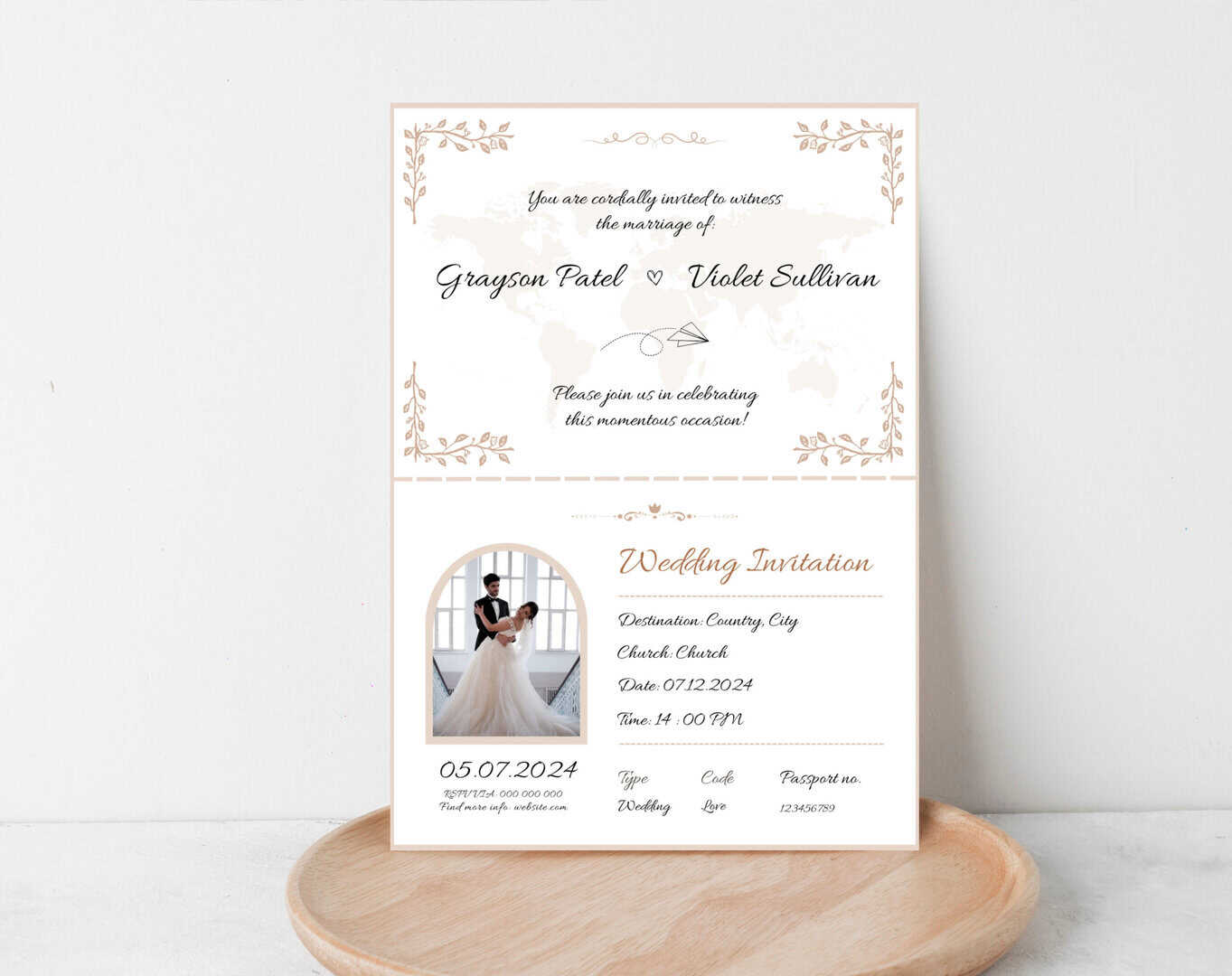 This airline ticket wedding invitation is a stylish and unique way to announce your wedding, setting the perfect mood for your adventure ahead!