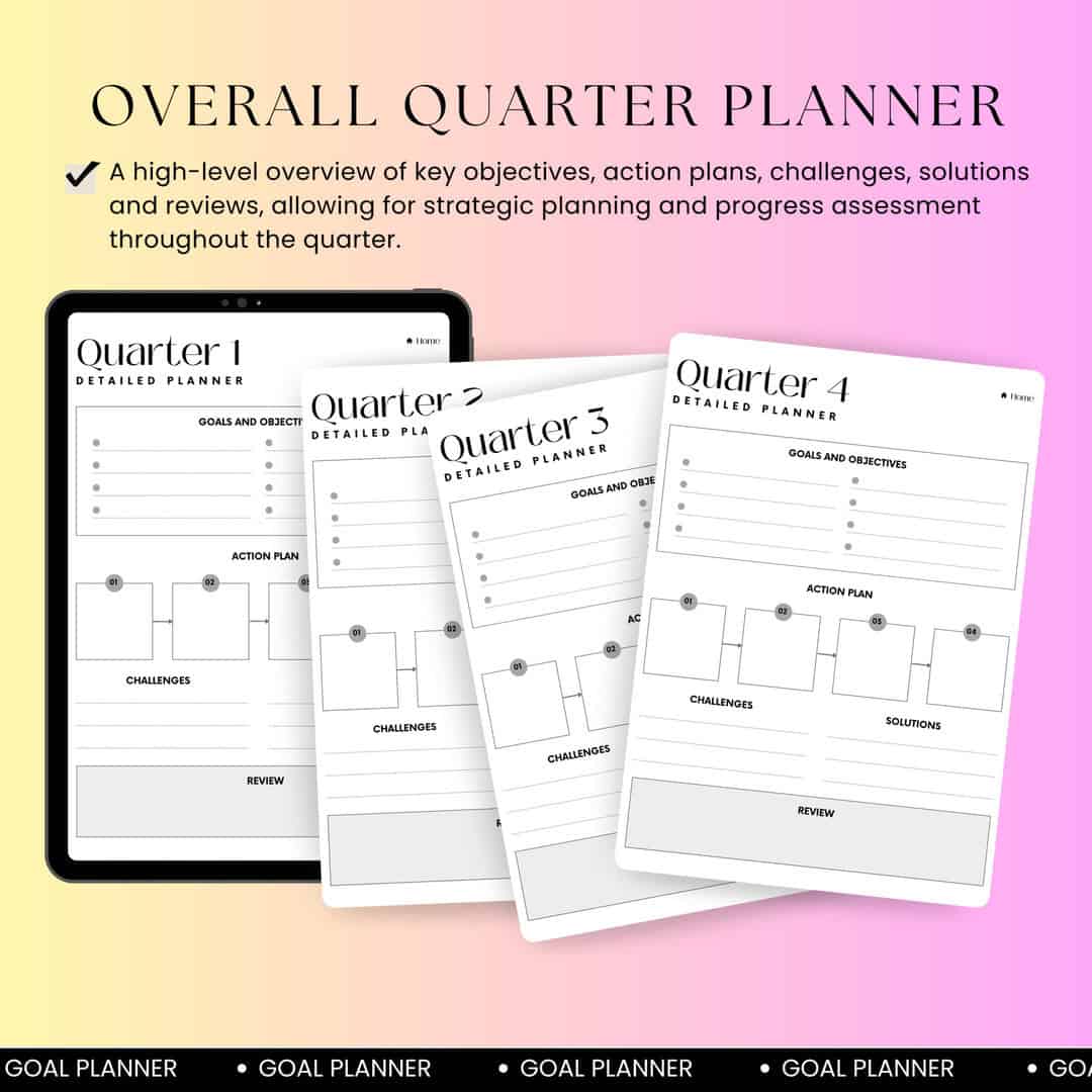 • 📋 Detailed Quarterly Planner: Dive deeper into your quarterly goals with actionable steps.