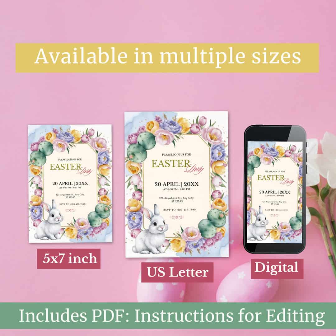 Celebrate Easter in style with our beautiful Easter invitations! Perfect for a cozy Easter Party, a stylish brunch gathering, or a cheerful spring celebration. These invitations are available as an instant digital download and feature adorable bunnies, Easter Bunny illustrations, and elegant spring elements.