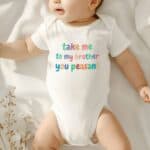 Bring a smile to everyone’s face with this funny baby bodysuit featuring the text “Take Me To My Brother You Peasant”. Perfect for families with a proud big brother or a baby who just can’t be without their sibling. This bodysuit makes a great baby shower gift, newborn present, or just a fun everyday outfit!