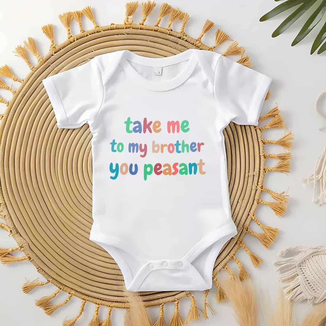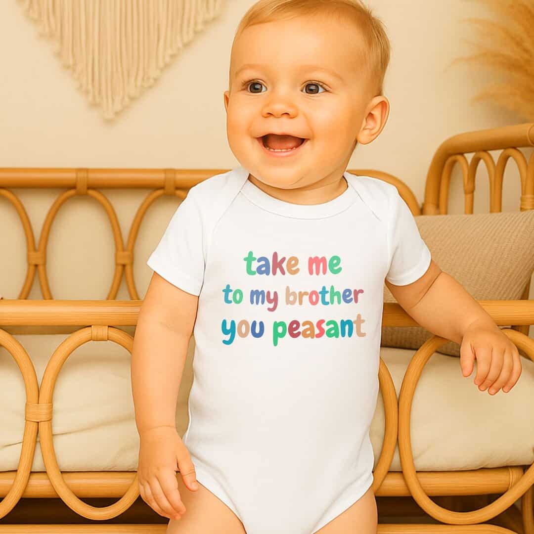 Bring a smile to everyone’s face with this funny baby bodysuit featuring the text “Take Me To My Brother You Peasant”. Perfect for families with a proud big brother or a baby who just can’t be without their sibling. This bodysuit makes a great baby shower gift, newborn present, or just a fun everyday outfit!
