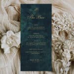 This stylish and customizable bar menu features an exquisite combination of gold and dark green — ideal for couples seeking a luxurious, modern wedding atmosphere. Perfect for your signature cocktails, wine lists, or any special drink offerings at your reception.