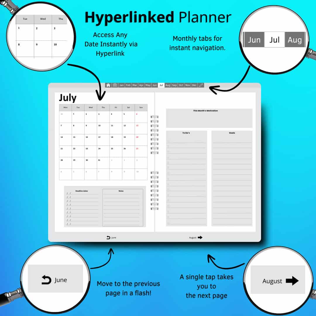 ✓ Hyperlinked Navigation – Quickly jump between daily, weekly, and monthly views.