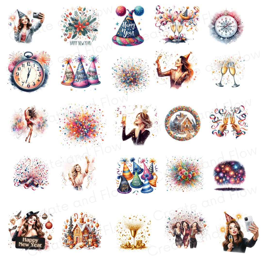 🍾 Whether you’re creating personalized greeting cards, eye-catching social media posts, or vibrant party decorations, these cliparts will take your creations to the next level and make them stand out like a disco ball at a dance party. They are also ideal for scrapbooking enthusiasts who want to document their New Year’s celebrations or for small business owners who want to create attractive promotional materials for the holidays.