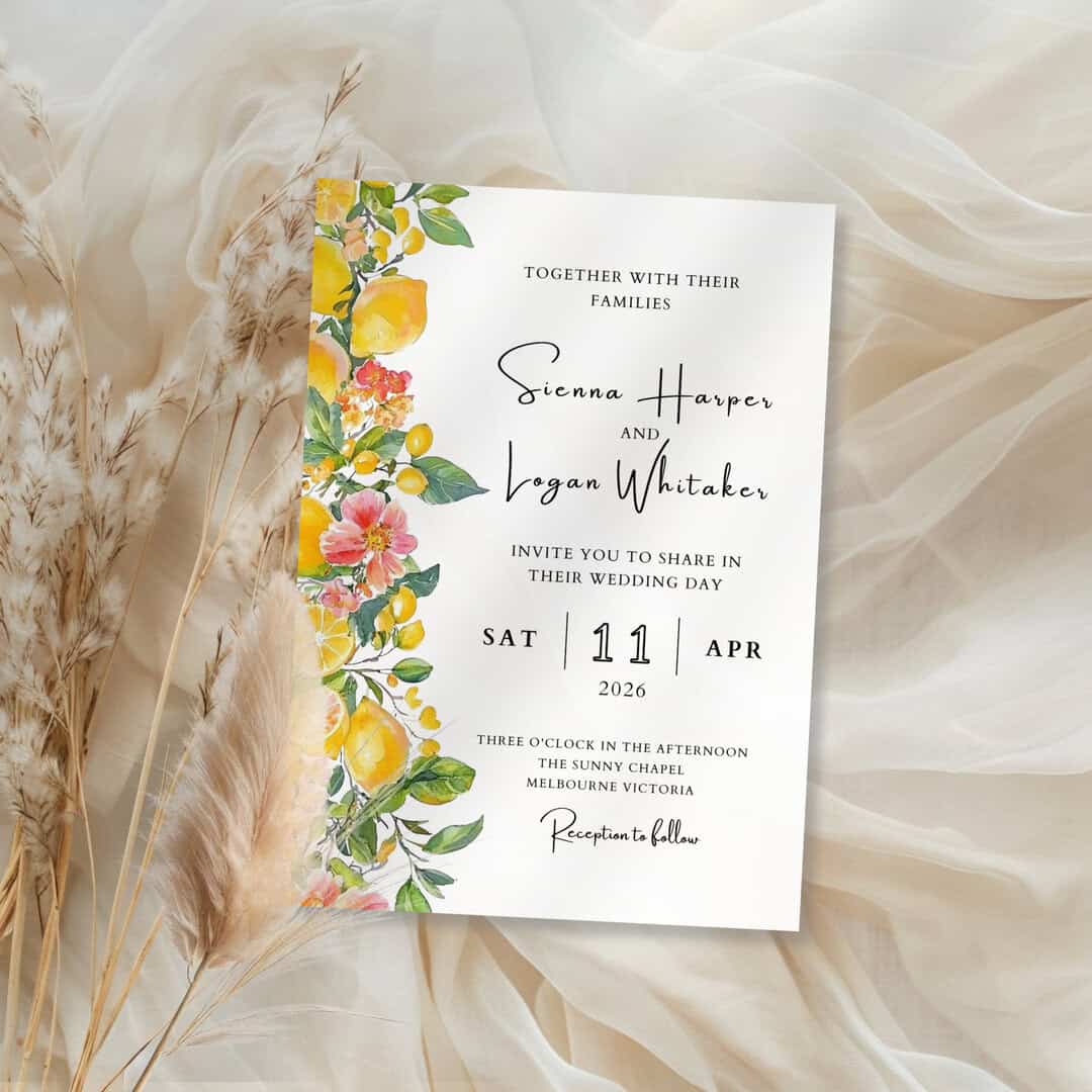 wedding invitation template, editable wedding invitation, editable wedding template, Canva wedding template, printable wedding invitation, lemon wedding invitation, citrus wedding invitation, Mediterranean wedding invitation, garden wedding invitation, spring wedding invitation, summer wedding invitation, destination wedding invitation, romantic wedding invitation