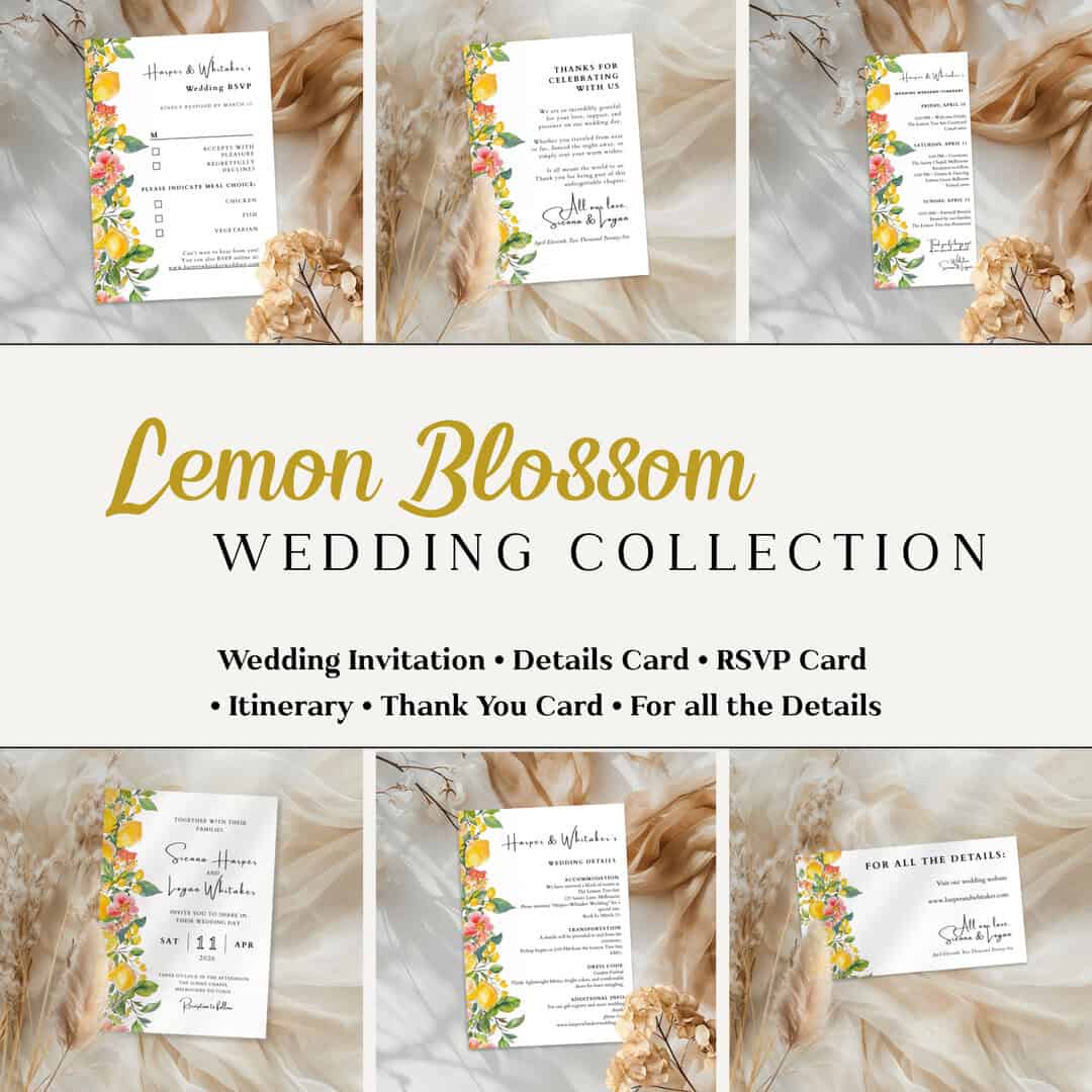 This editable template is part of the Lemon Blossom Wedding Collection, inspired by the charm of Mediterranean weddings, soft florals, and fresh citrus accents. Whether you’re planning a garden wedding or a destination wedding, this cheerful design sets the tone for a joyful and romantic day.