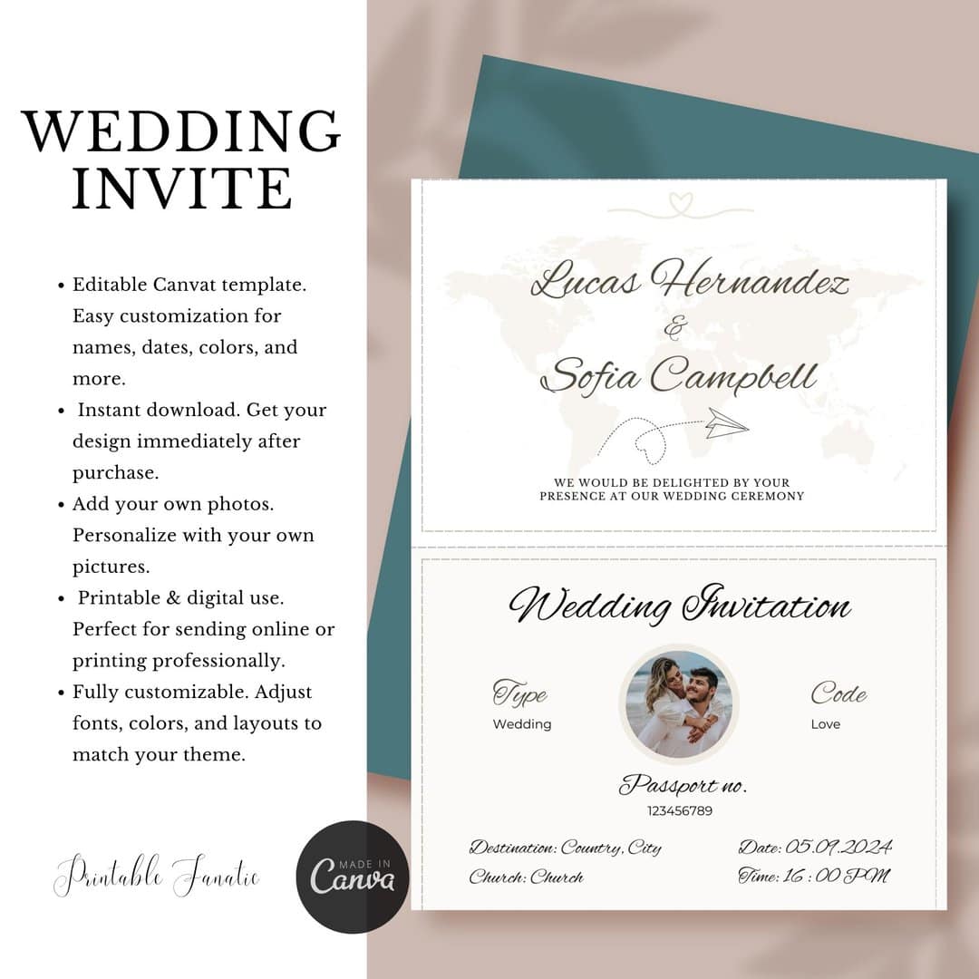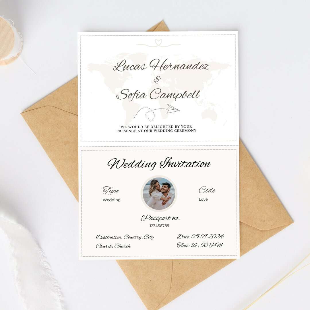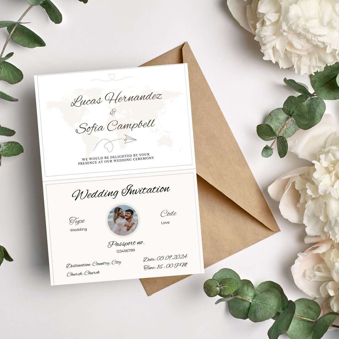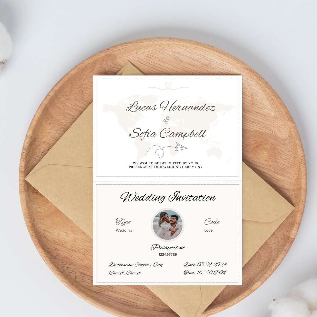 For modern simplicity, choose this minimalistic boarding pass wedding invitation. Customize easily in Canva.