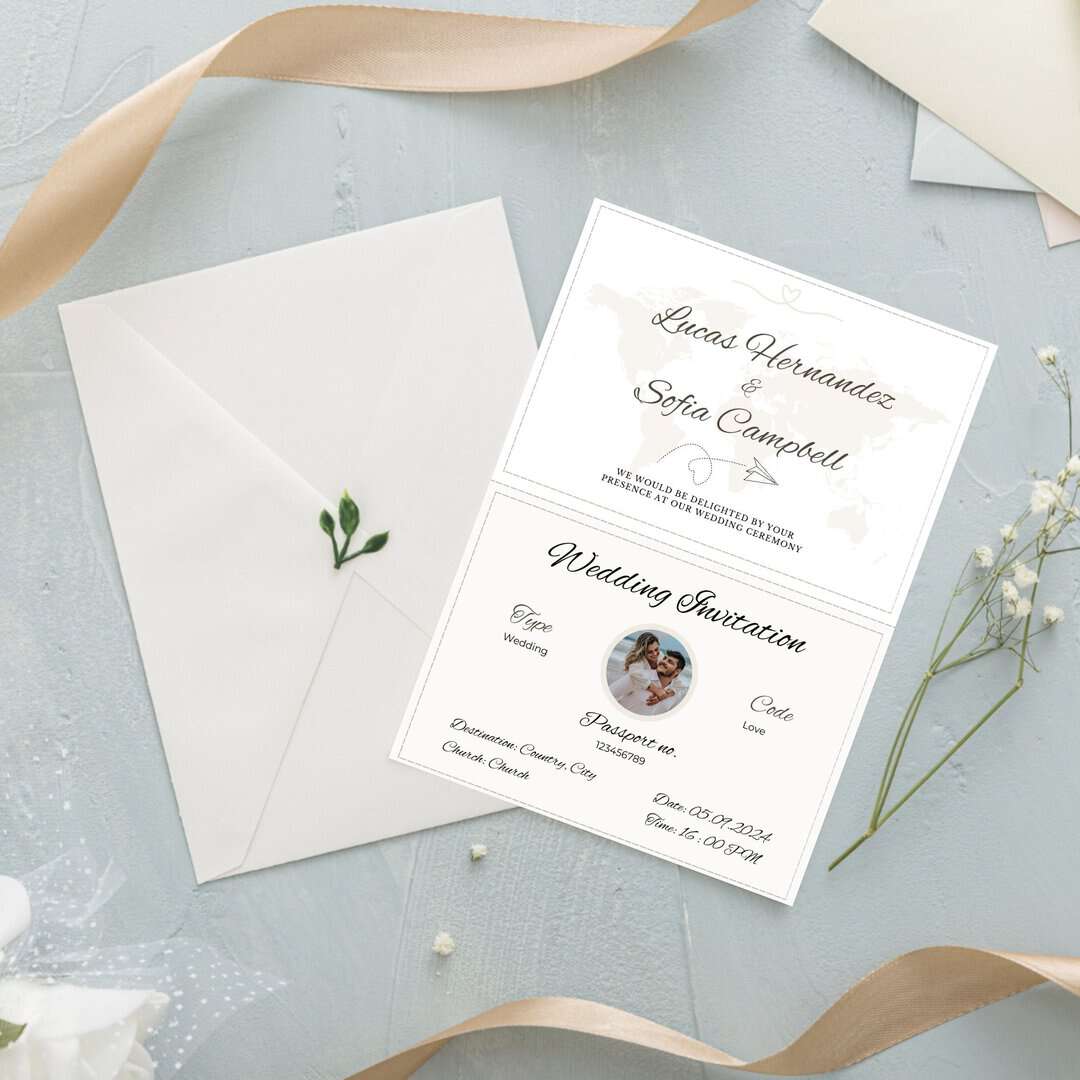 Keep things clean and contemporary with our Minimalistic Boarding Pass Wedding Invitation Template. Perfect for modern couples, this design features a sleek layout that highlights your wedding details with understated elegance.