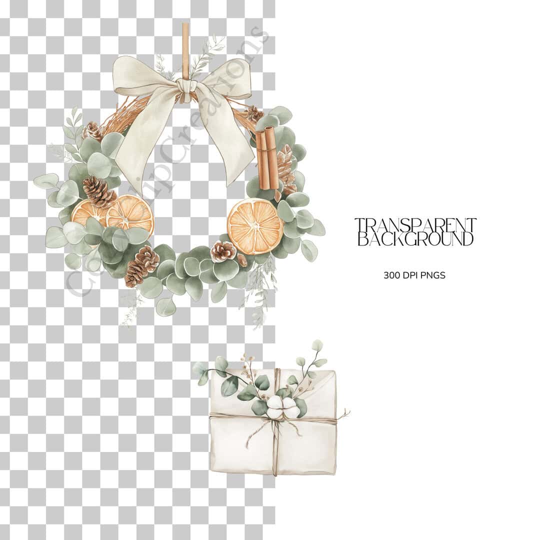 Neutral boho christmas clipart bundle | Christmas ornaments png | Christmas invitations and cards clipart | Eucalyptus wreath clipart