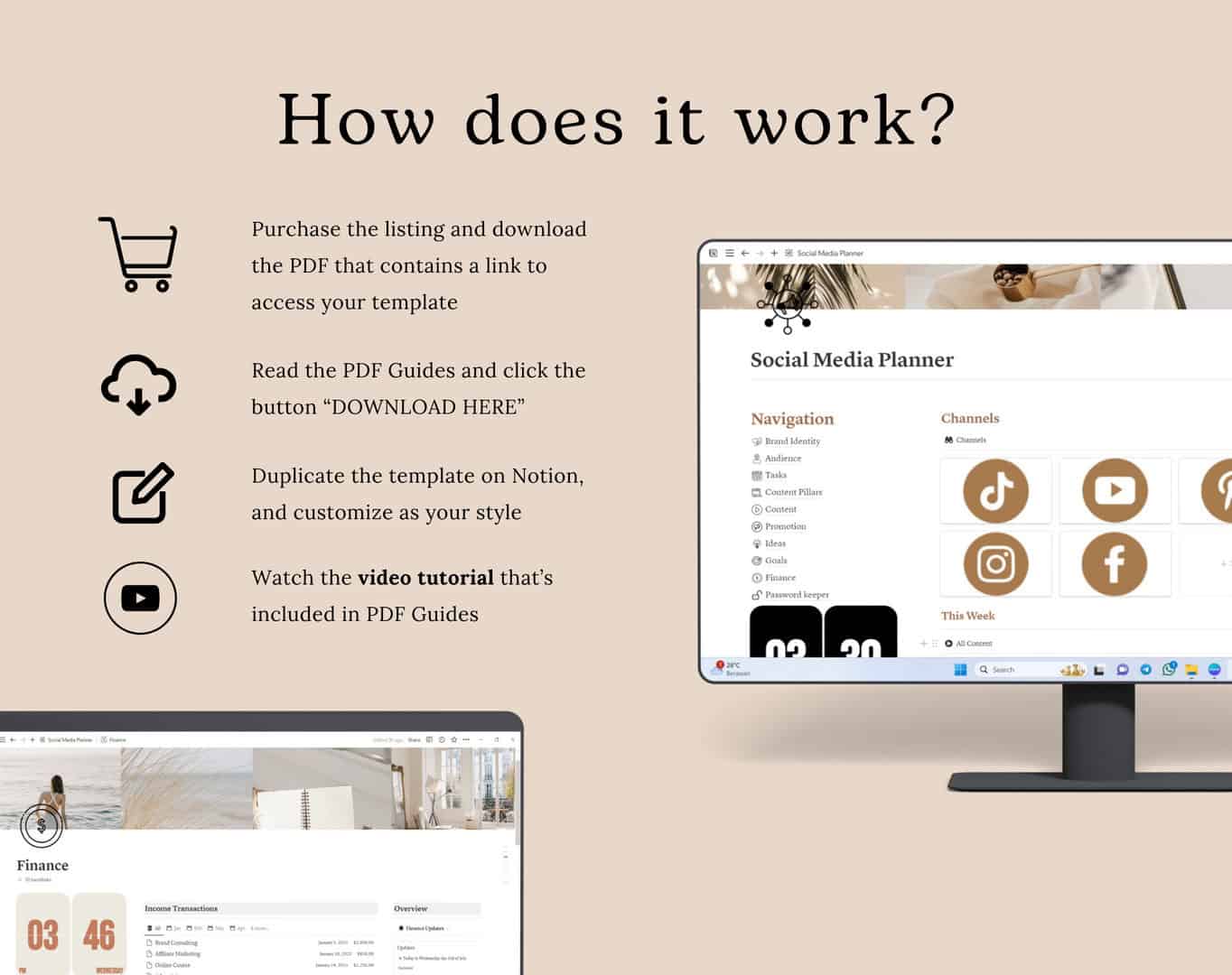 After you purchased the Notion planner, you will find a video tutorial link in the PDF. It shows how you can use the Notion Template and how to download it into Notion.so.