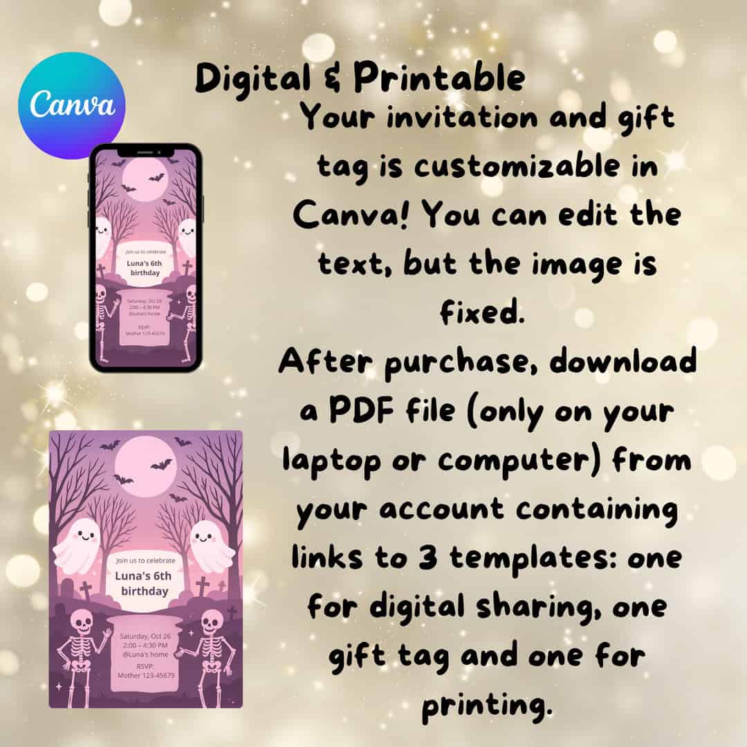 ๐โจ Pink Halloween Birthday Invitation digital, printable and gift tag bundle! โจ๐