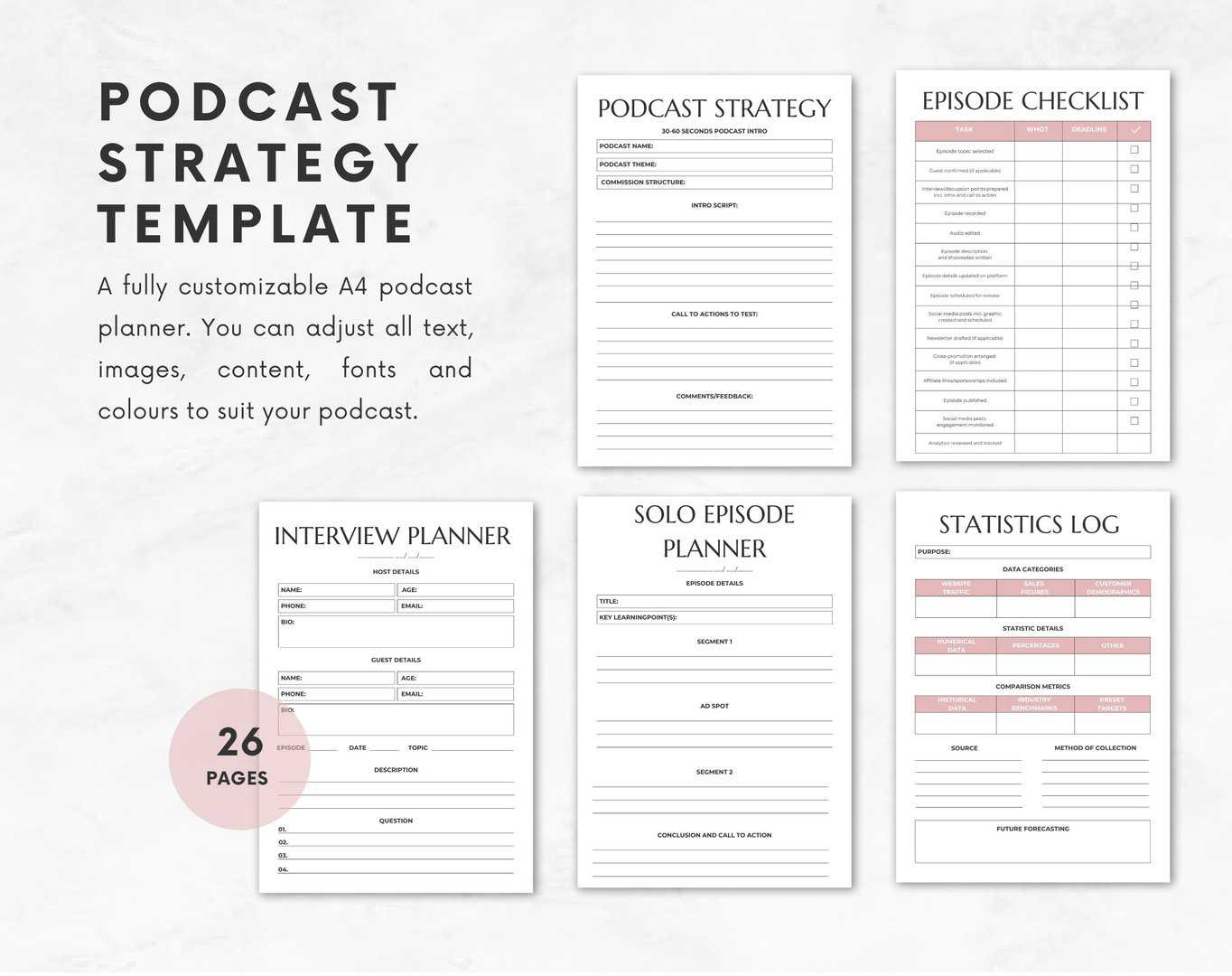 A fully customizable A4 podcast planner. You can adjust all text, images, content, fonts and colours.