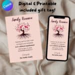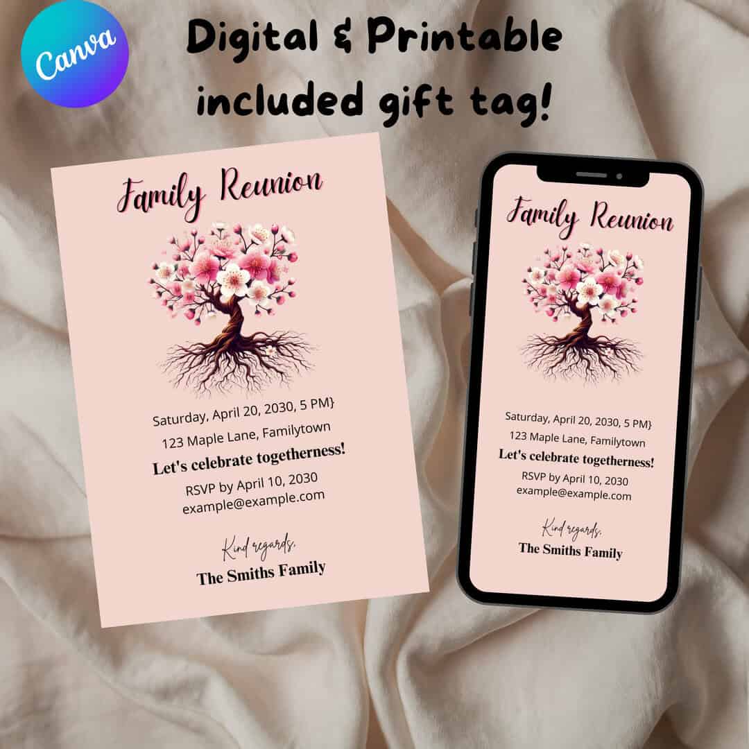 Printable & digital Family reunion invitation pink blossom tree, included gift tag