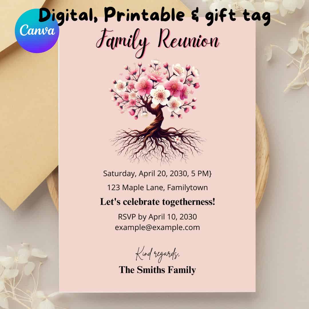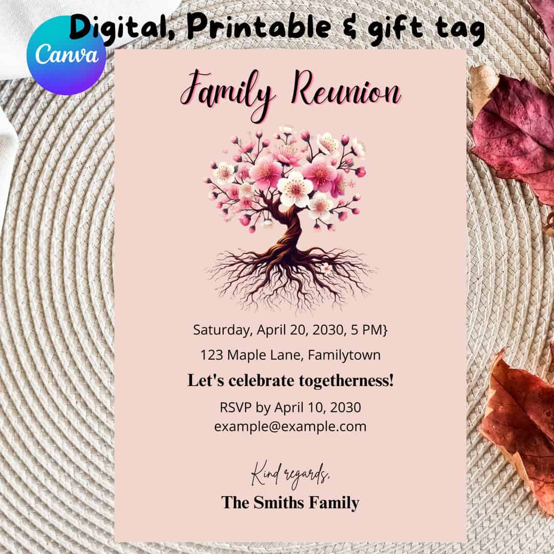 Family reunion invitation, pink blossom tree theme, customizable invite, digital invitation, printable design, cheerful family gathering, elegant reunion invite, Canva template, family celebration decor, joyful family event.