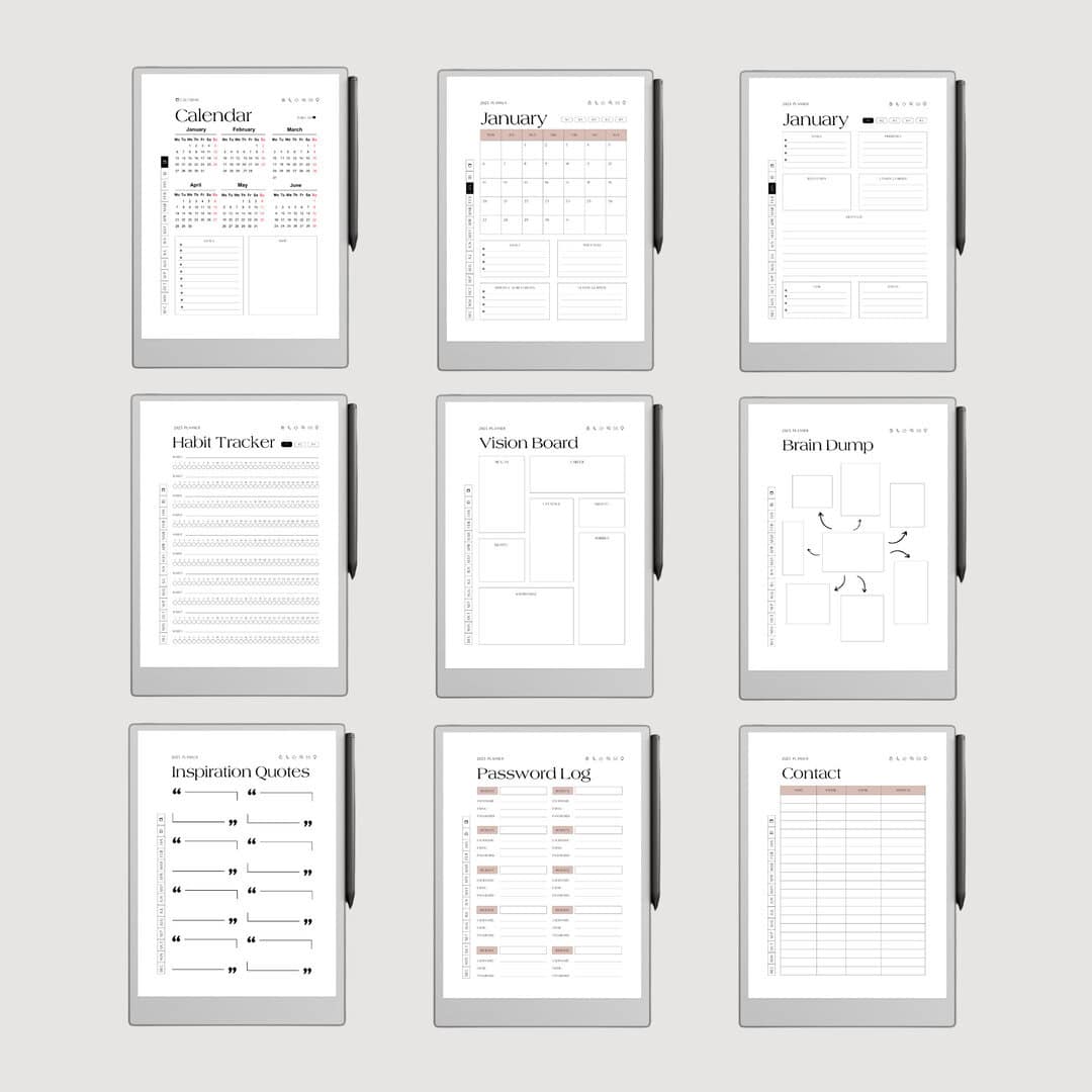 Our 2025 planner for the reMarkable Paper Pro is more than just a calendar—it’s your all-in-one productivity tool. In addition to a full-featured monthly and weekly planner, it includes a vision board to set your goals, a habit tracker to stay consistent, a brain dump section for all your creative thoughts, a password log for secure information, a contact sheet for important connections, and space to save your favorite inspirational quotes. The PDF is hyperlinked, you you can browse to the right page in a second. Stay organized, focused, and inspired throughout the year!