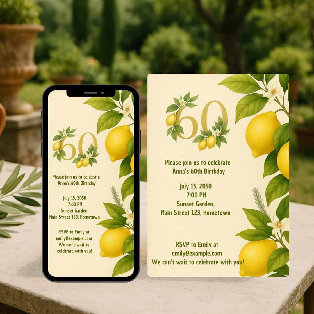 Celebrate 60 years of cherished memories and joy with this elegant Birthday Invitation Set, featuring a summer lemon design. Perfect for gathering loved ones to honor this incredible milestone, the set includes a customizable invitation and a heartfelt thank-you gift tag.