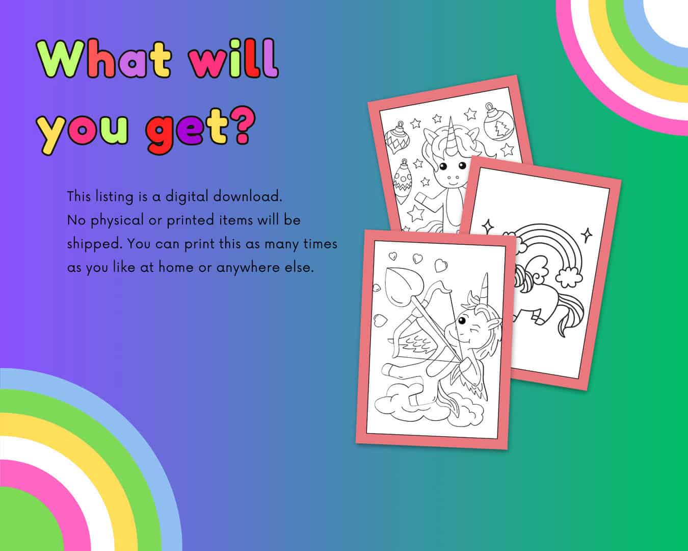 Our kawaii coloring book includes a variety of unicorn activities that spark creativity and imagination. As a digital download, you can print the pages as many times as you’d like, making it a wonderful addition to any child’s activity set.