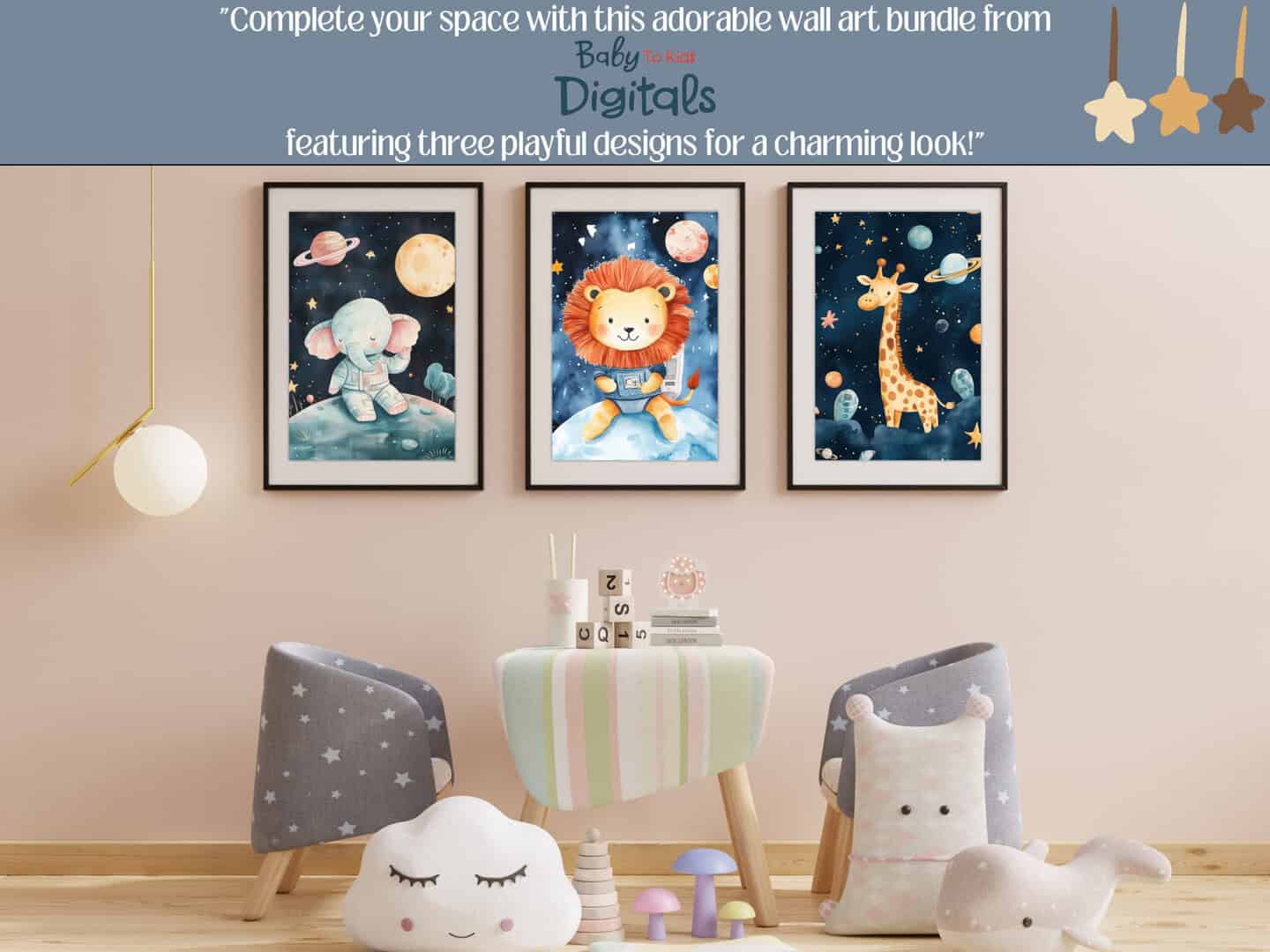 Take your little one on an intergalactic safari with the Watercolor Space Safari Adventure Collection! This magical set of three watercolor prints features a baby elephant floating on a distant planet, a brave lion exploring the galaxy, and a curious giraffe wandering through the stars. Perfect for a space-themed nursery, toddler room, or adventure-loving child’s decor, this whimsical bundle brings wonder, imagination, and exploration to any space.
