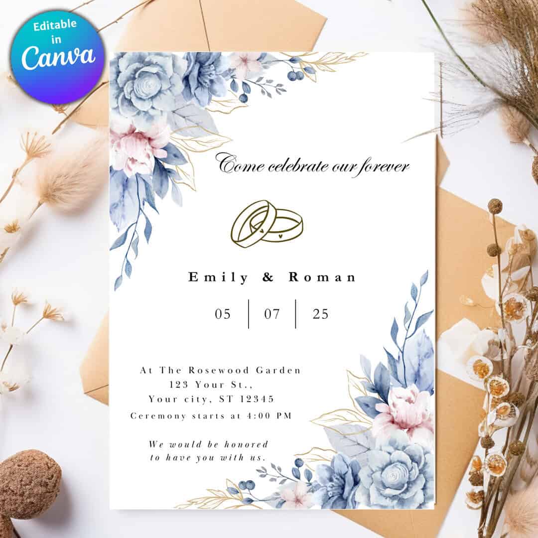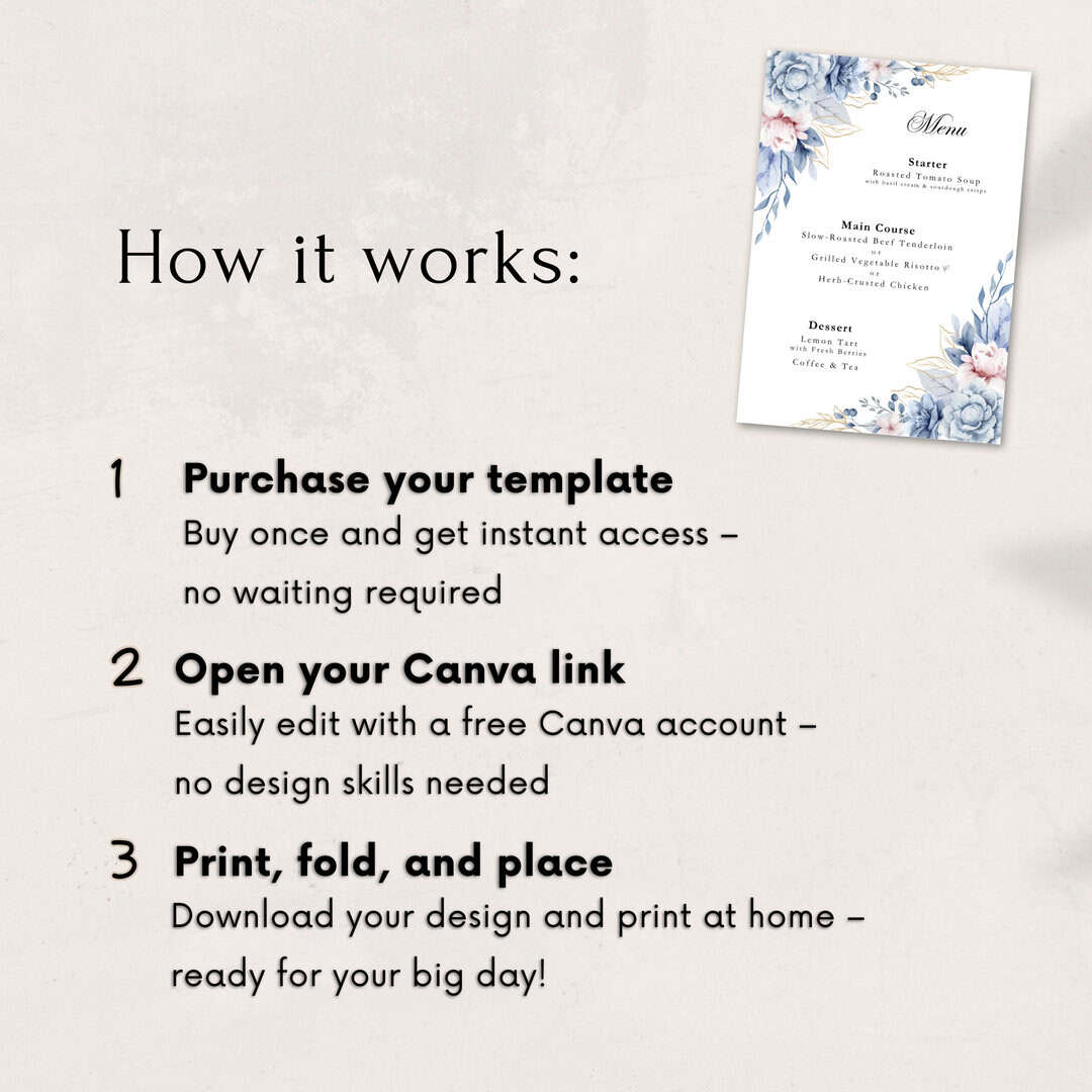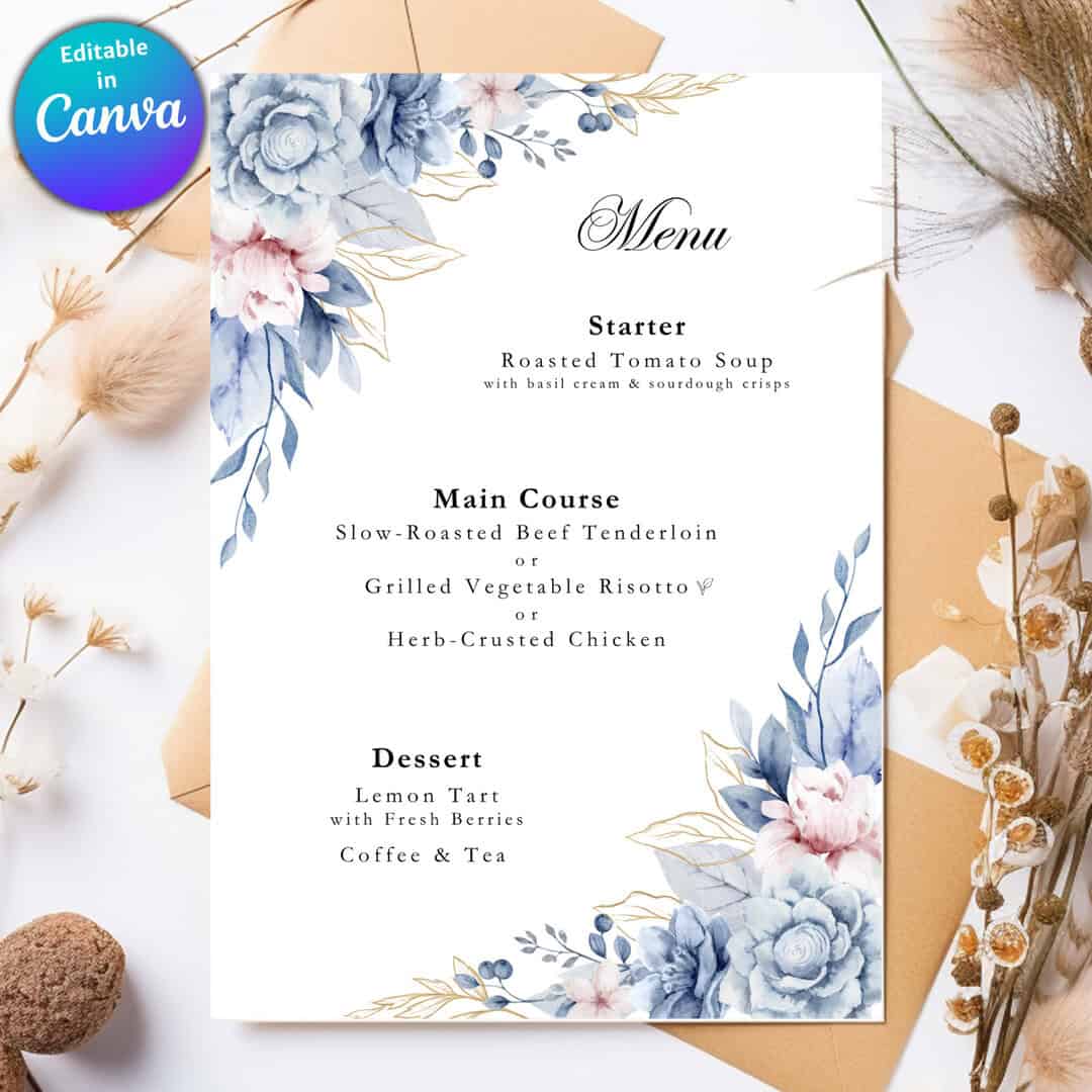 Create a beautiful wedding menu in minutes with this editable Canva menu card template. Customize your design with ease – no Canva Pro needed. Perfect for digital sharing or home printing!