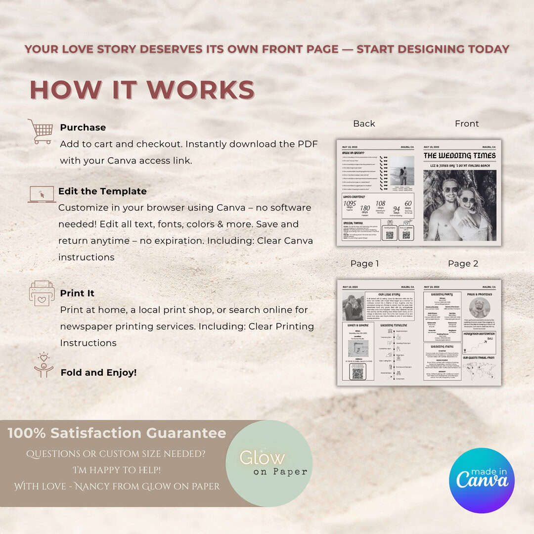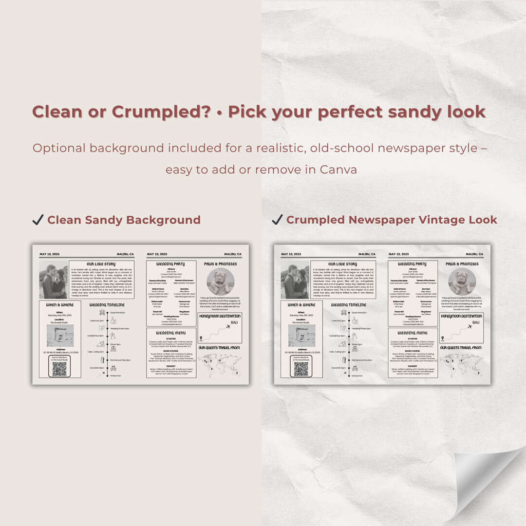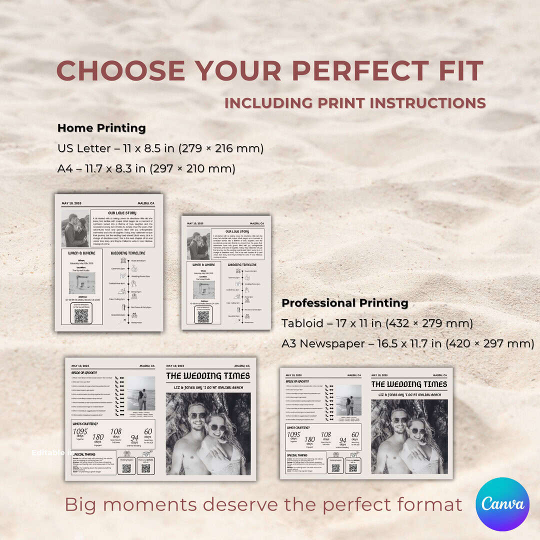 Wedding Newspaper Template – Boho Beach Wedding Invitation – Editable in Canva – Save the Date, Program & Timeline – Instant Download